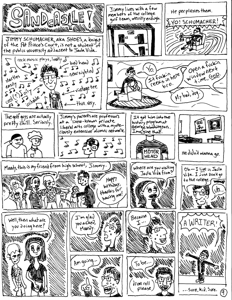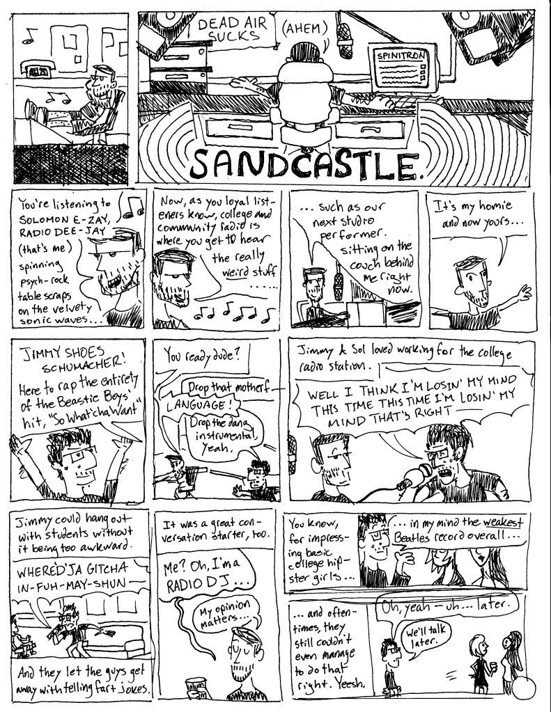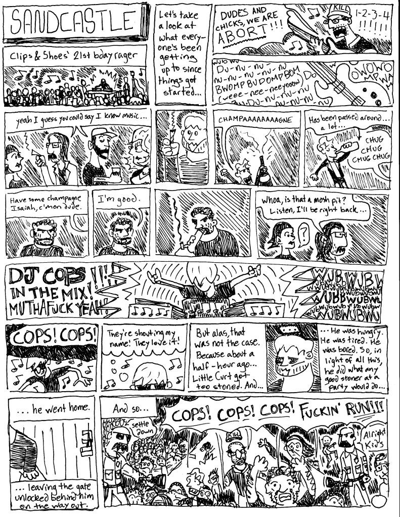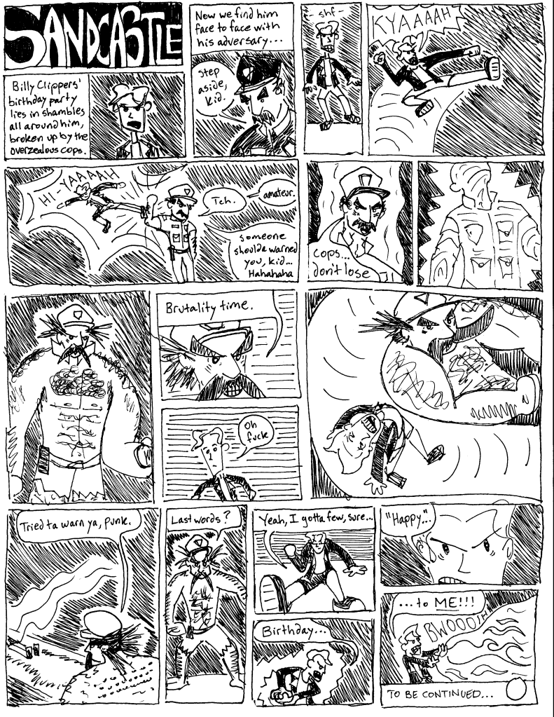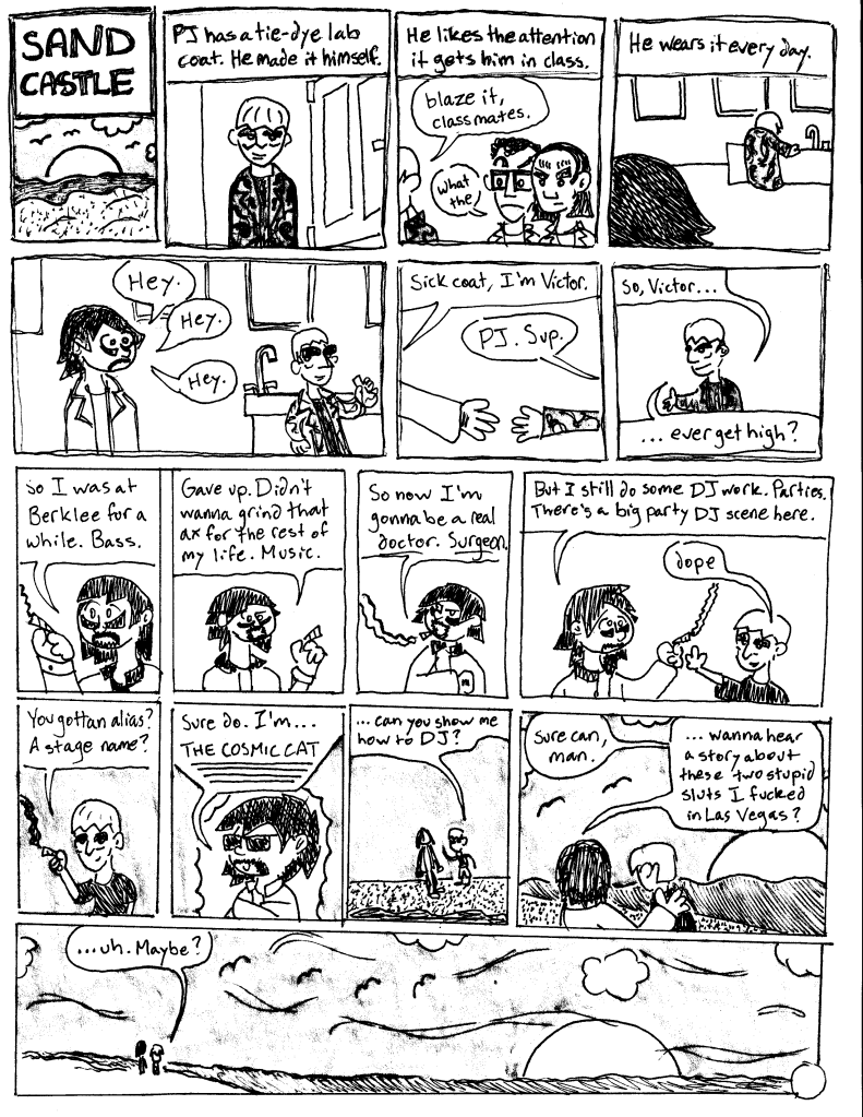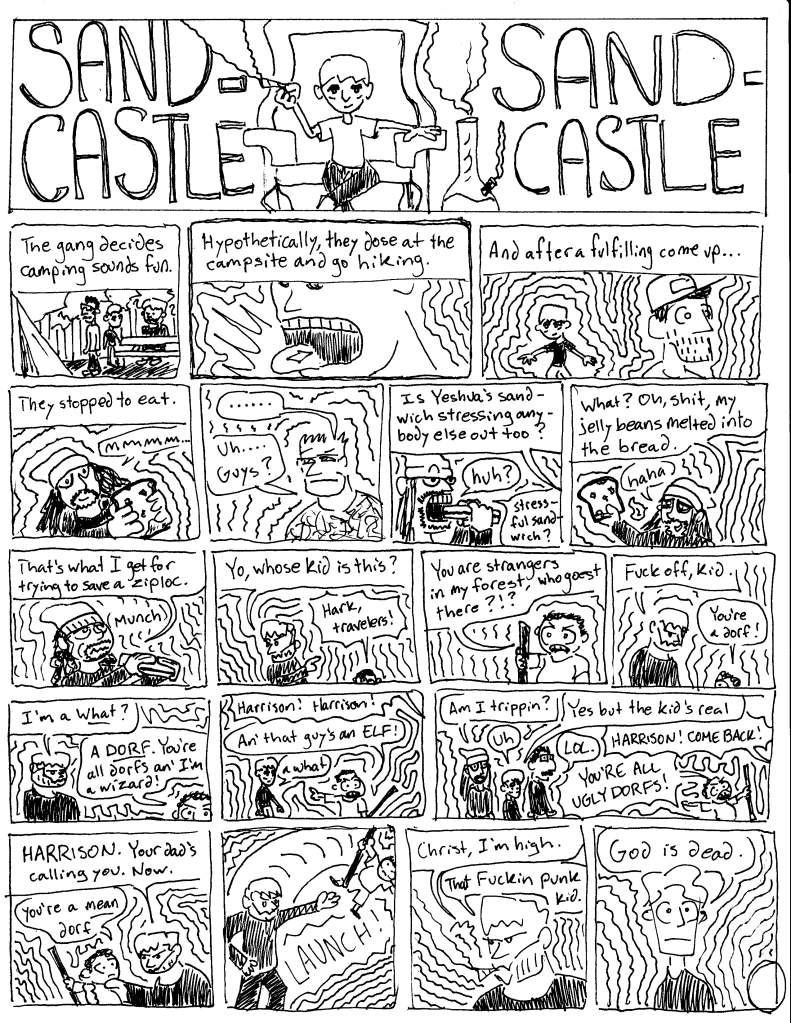 The first iteration of Sandcastle was a partly finished graphic novel written and drawn in black ink, mostly on sheets of newsprint in 2020.