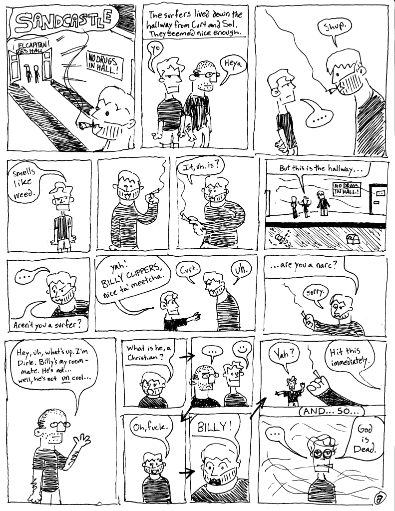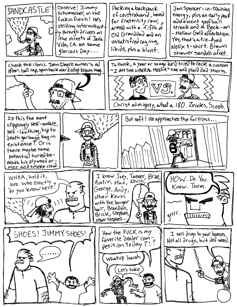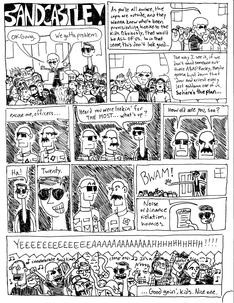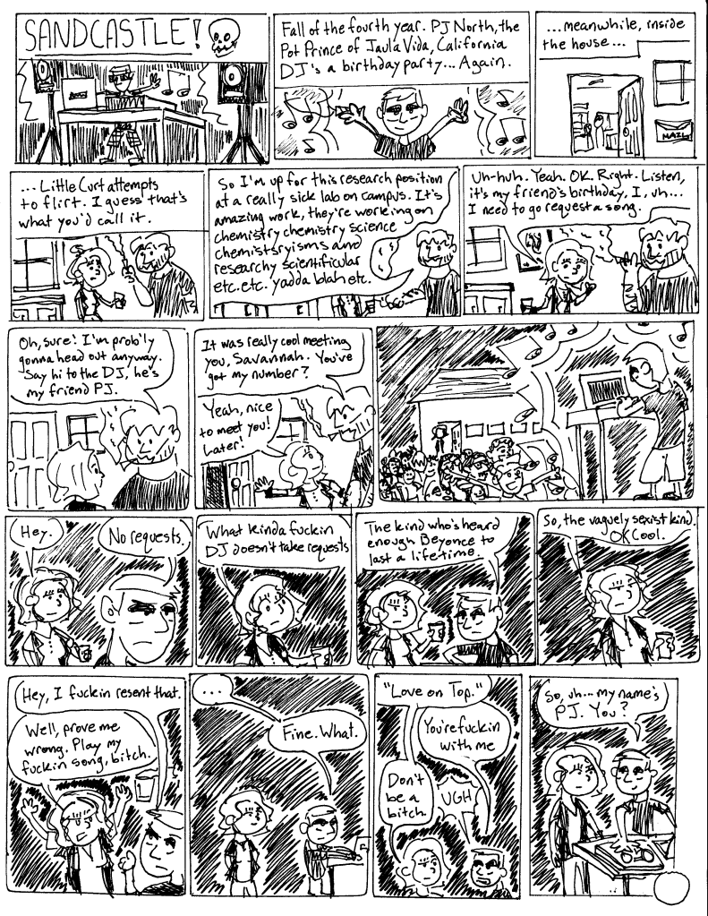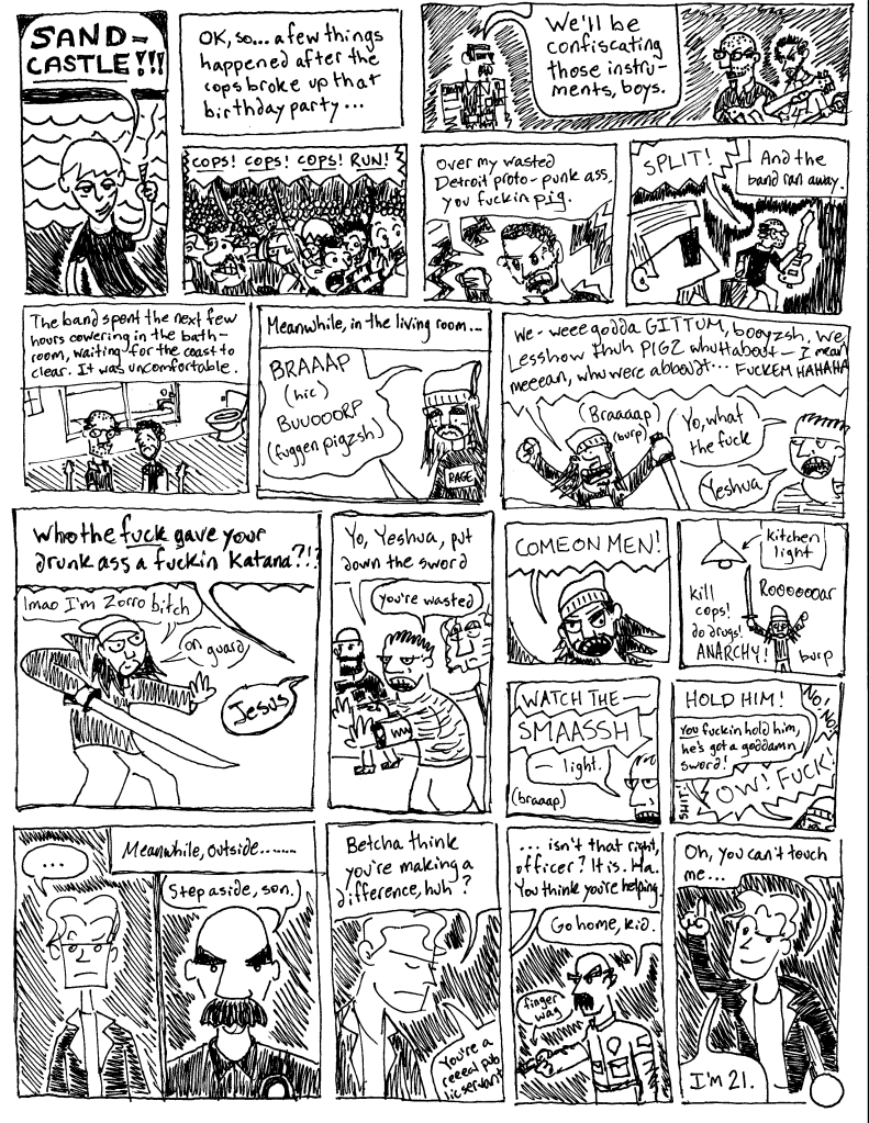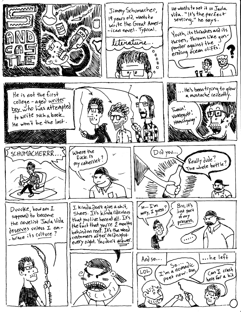 The first iteration of Sandcastle was a partly finished graphic novel written and drawn in black ink, mostly on sheets of newsprint in 2020.